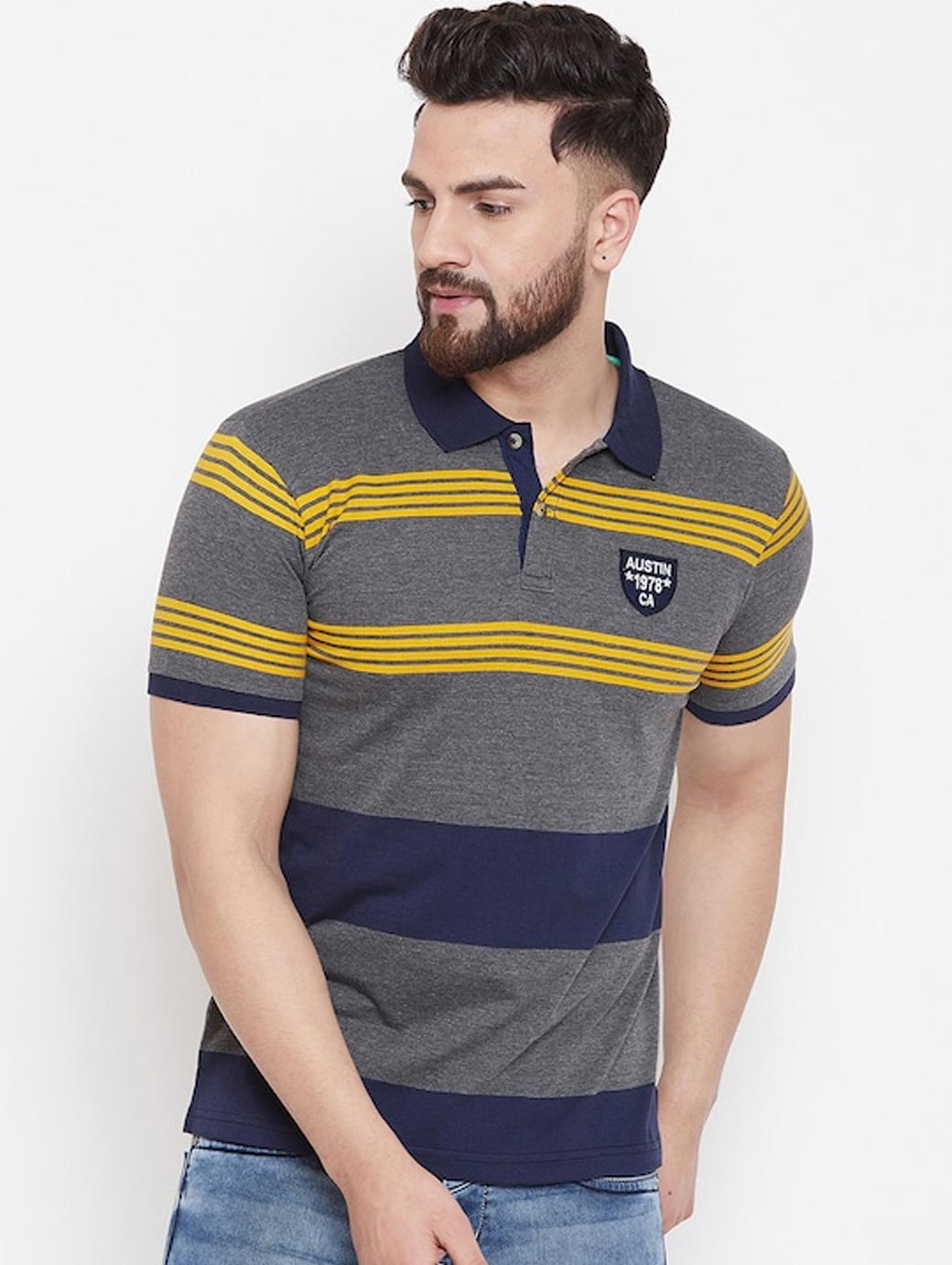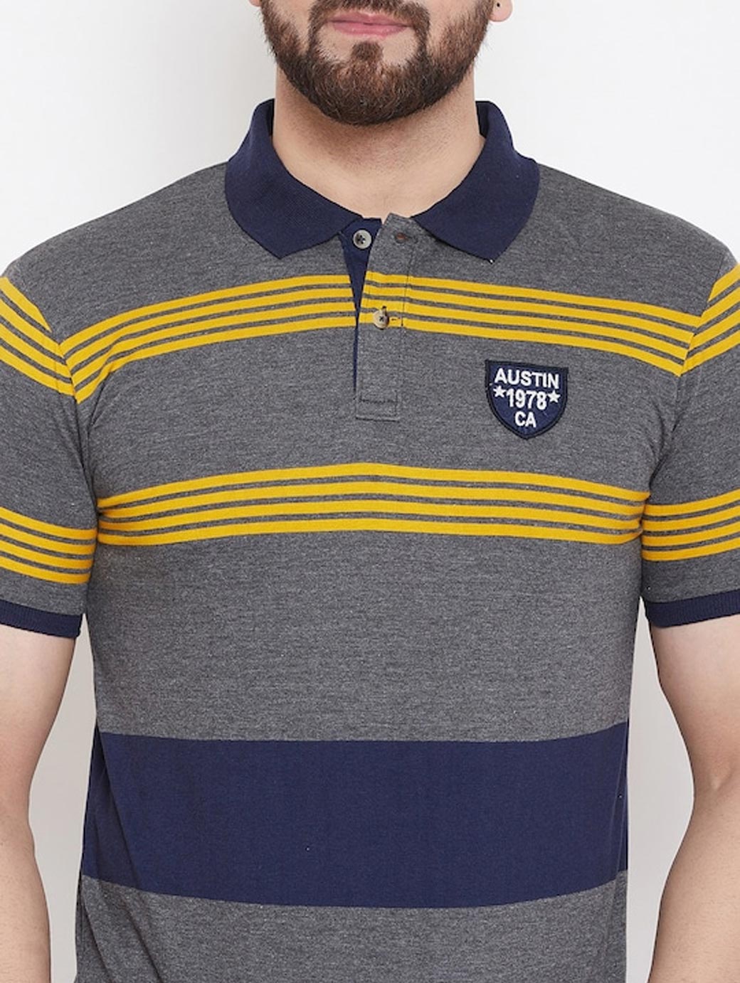 Men Grey Striped Polo Collar T-shirt