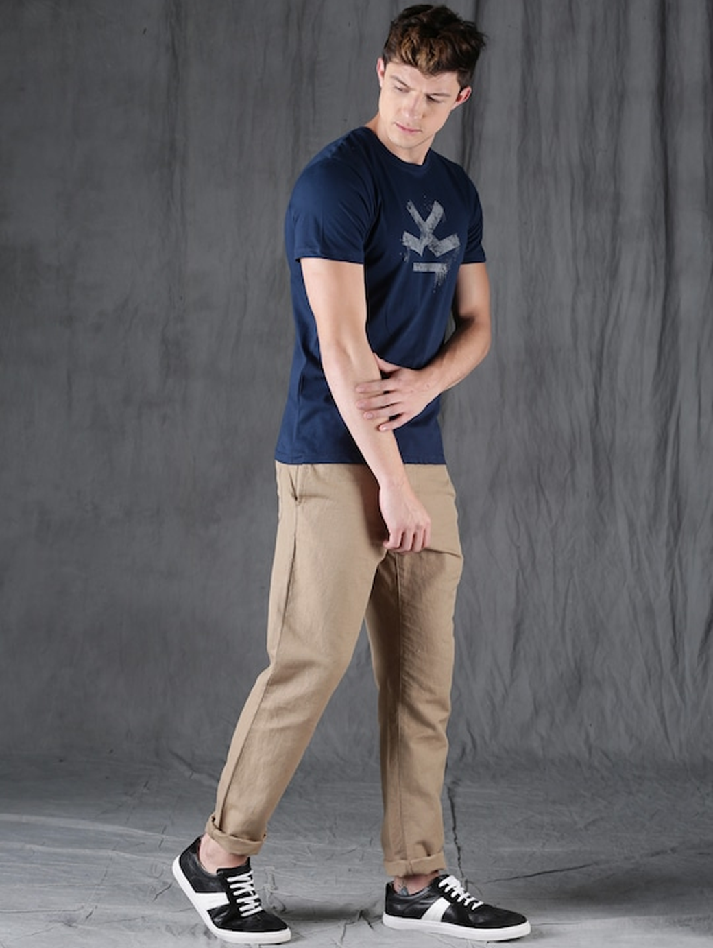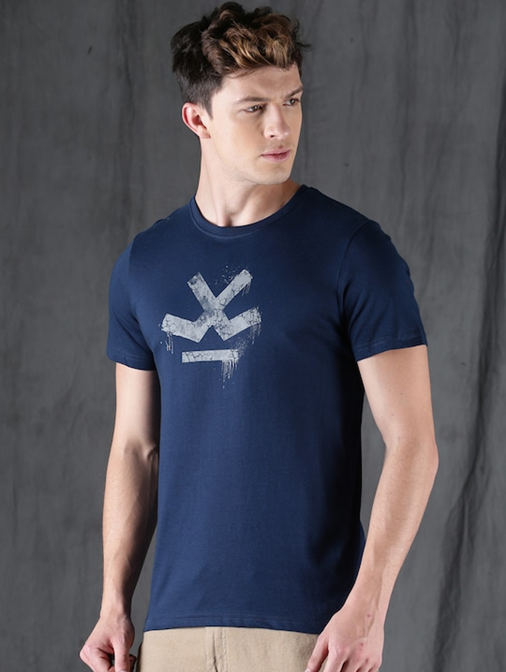 Navy Blue printed T-shirt, has a round neck, short sleeves