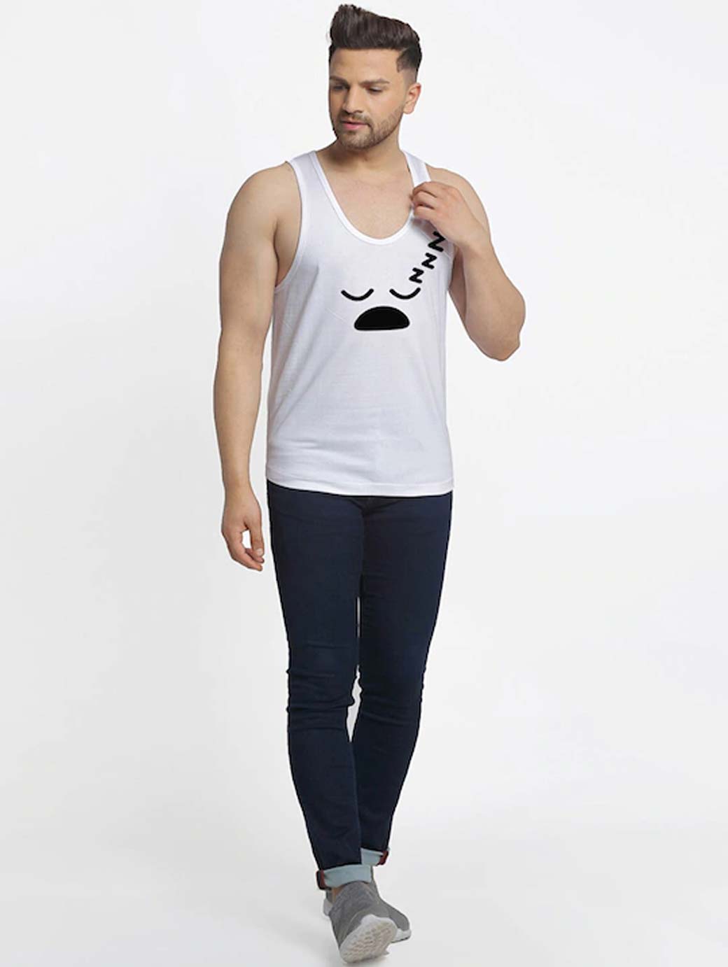 Pack of 2 printed innerwear gym vests White and black sleepy printed innerwear vest, has a round neck, sleeveless White and grey California bike rider printed innerwear vest, has a round neck, sleeveless