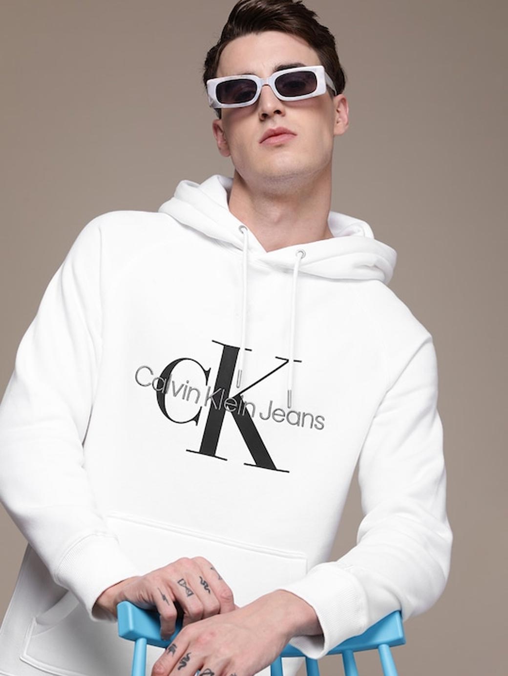 White printed sweatshirt has a hood, 2 insert pocket pockets, long sleeves, closure, ribbed hem