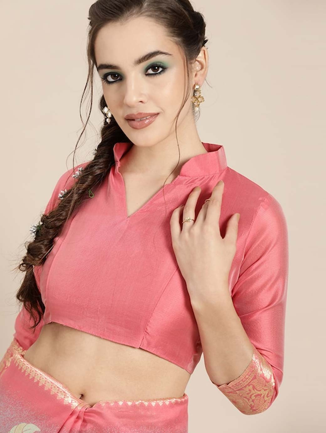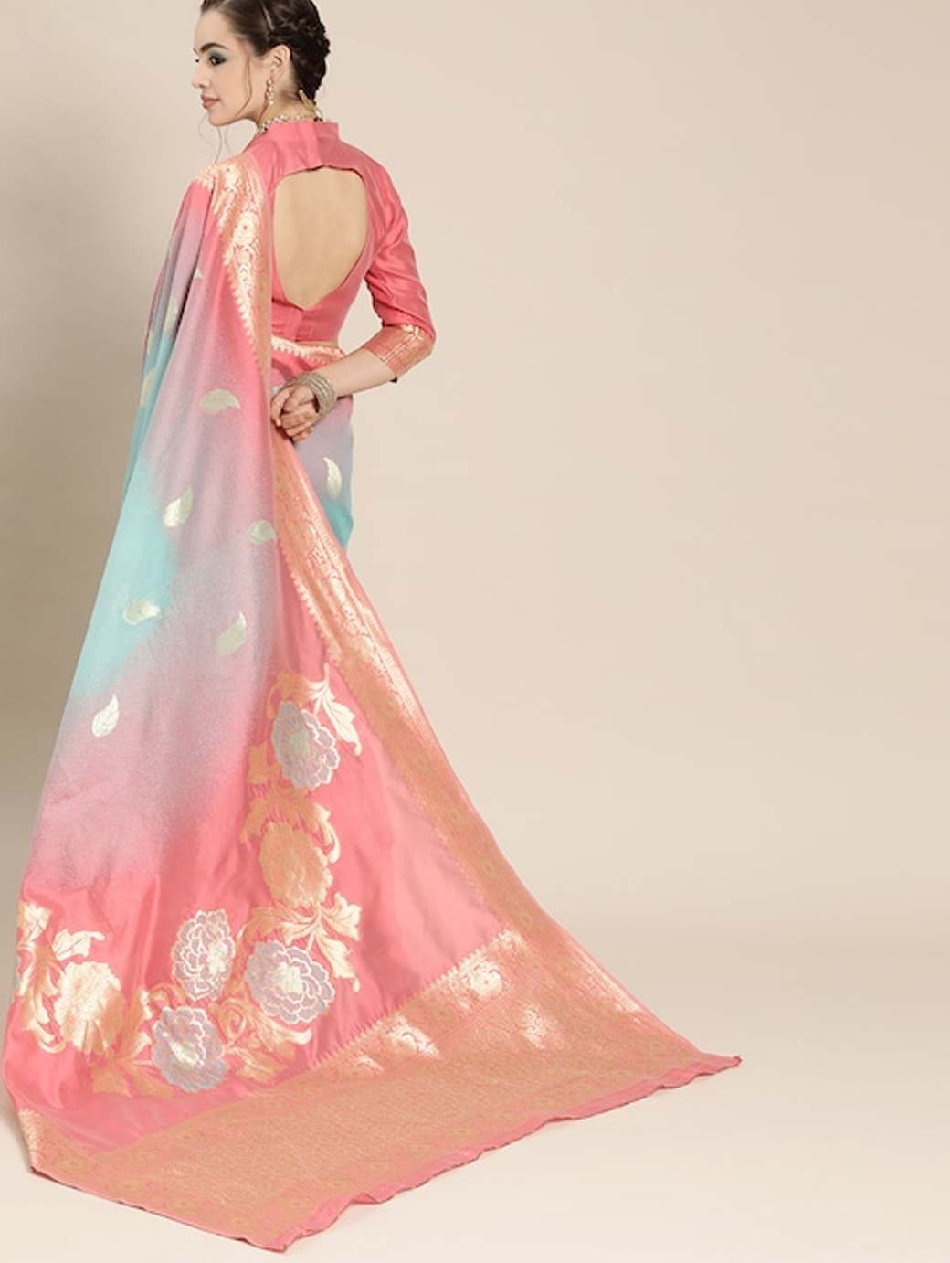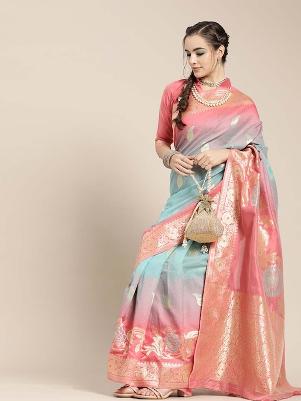 Breathe life into your ethnic collection by adding this elegant-looking saree. Designed with a floral print, woven border, and a silk blend fabric, this piece is sure to add to your appeal. Design Details