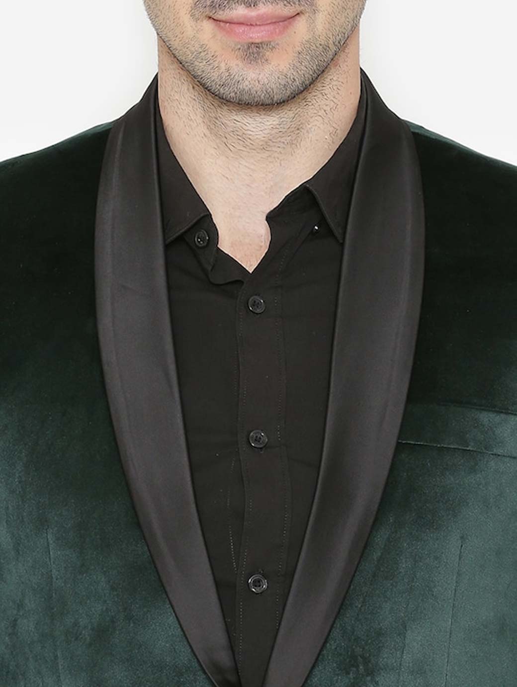 Green solid velvet tuxedo blazer, has a shawl collar, single-breasted with a single button closure, long sleeves, two flap pockets, one chest welt pocket