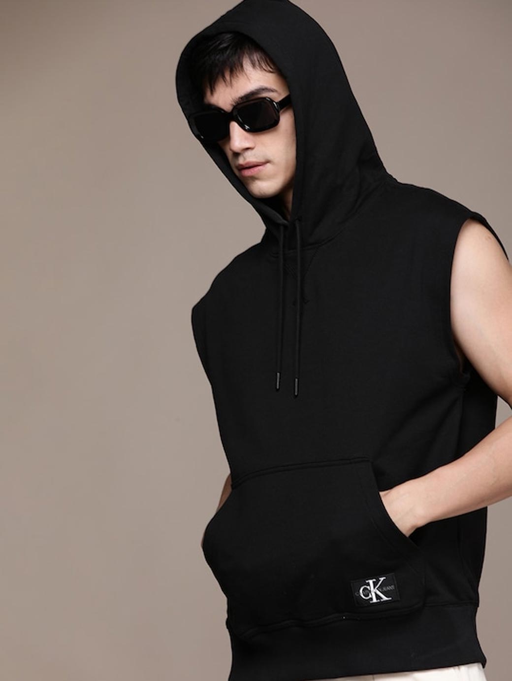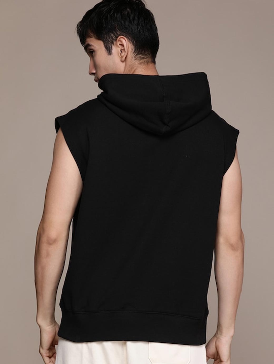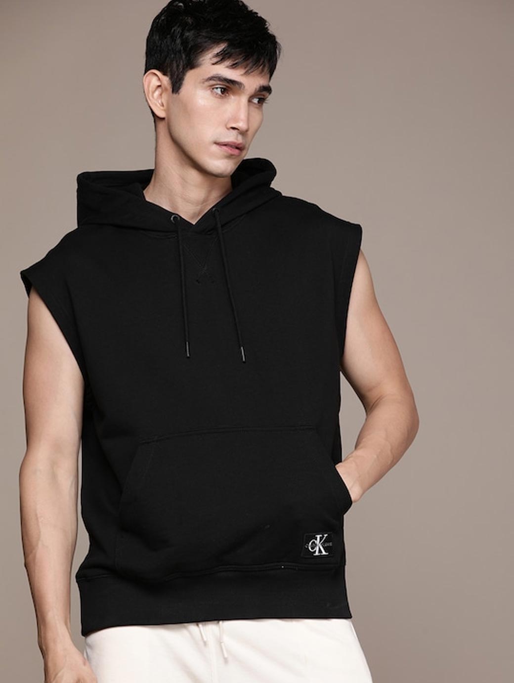 Black solid sweatshirt has a hood, 2 insert pockets, sleeveless, and, ribbed hem
