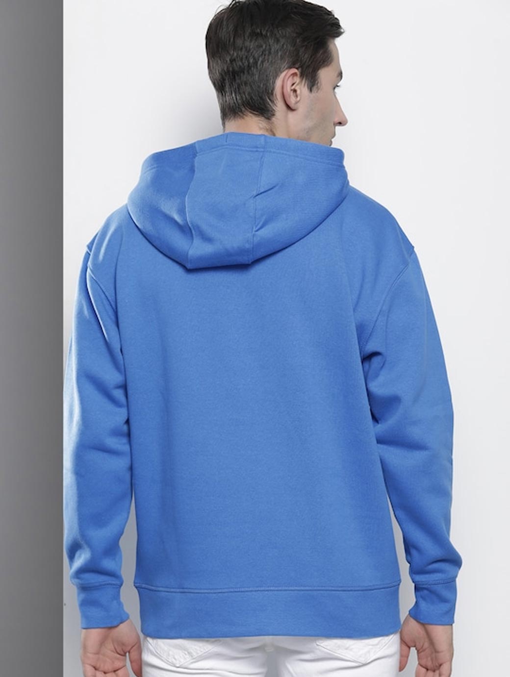 Blue brand logo embroidered [pullover sweatshirt has a hood, 1 kangaroo pocket, long sleeves, closure, ribbed hem