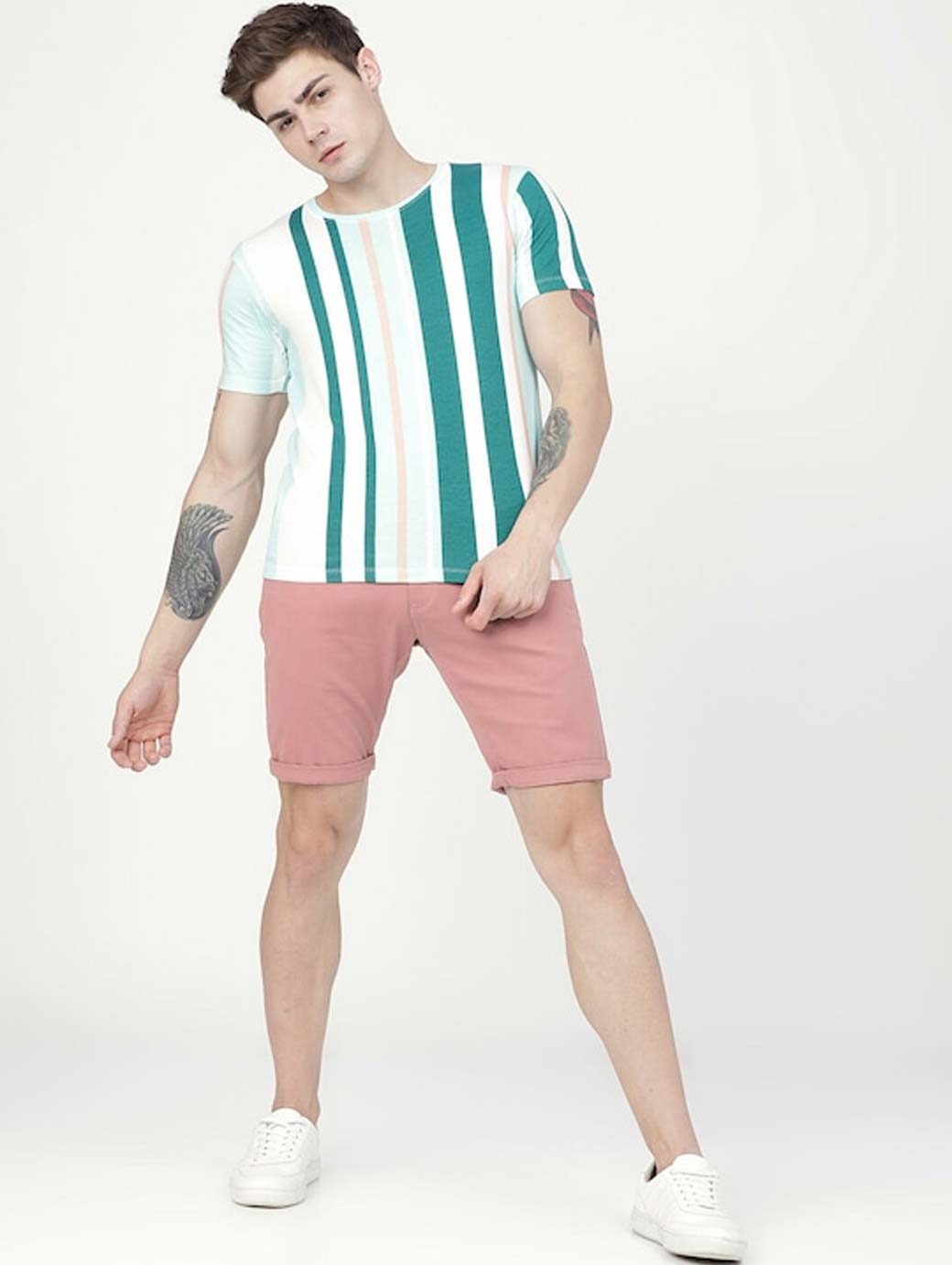 Grey striped mid-rise slim fit shorts has button closure and 4 pockets