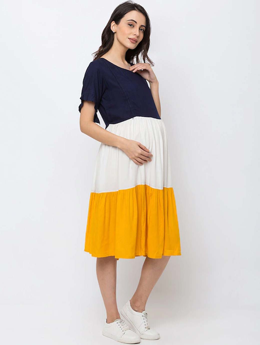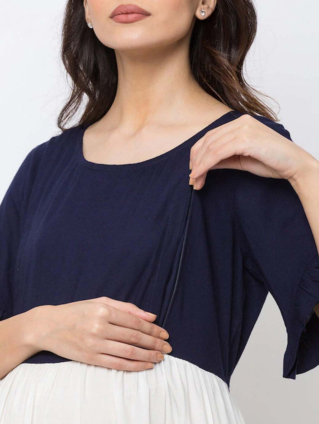 Navy Blue and White colourblocked knitted Nursing fit and flare dress, has a round neck, short sleeves, concealed zip closure, and flared hem