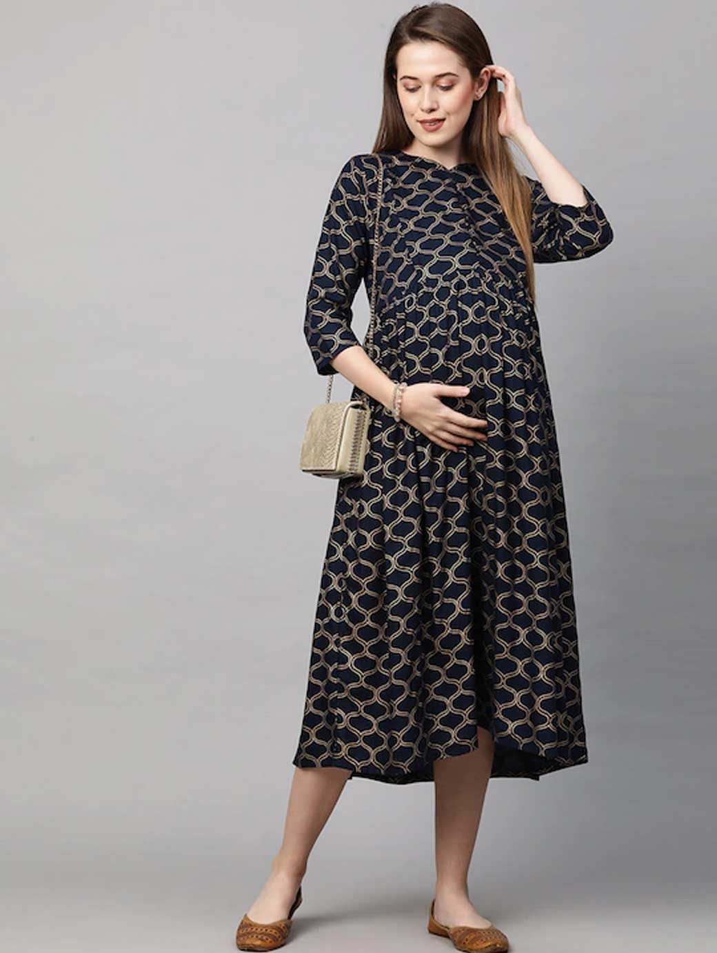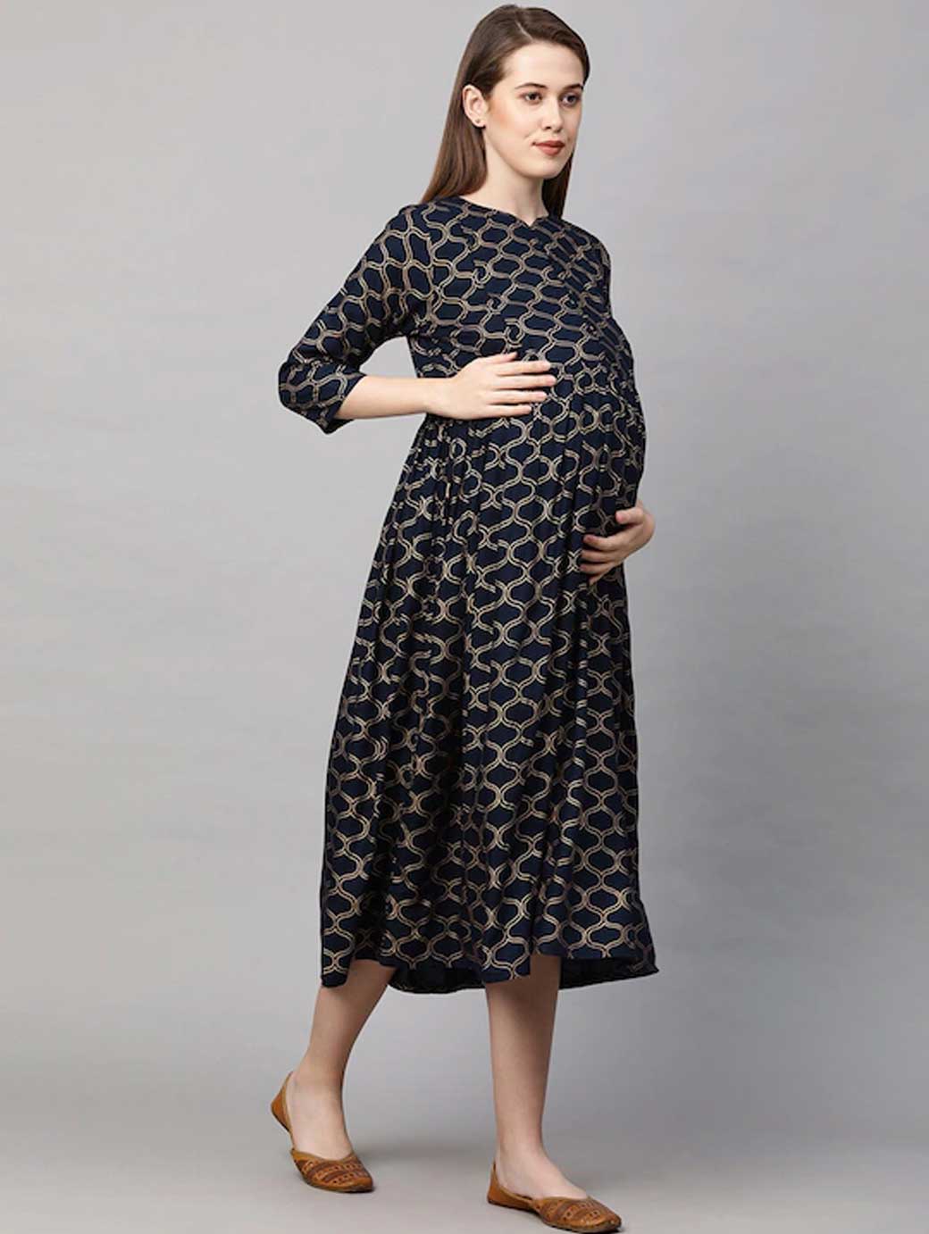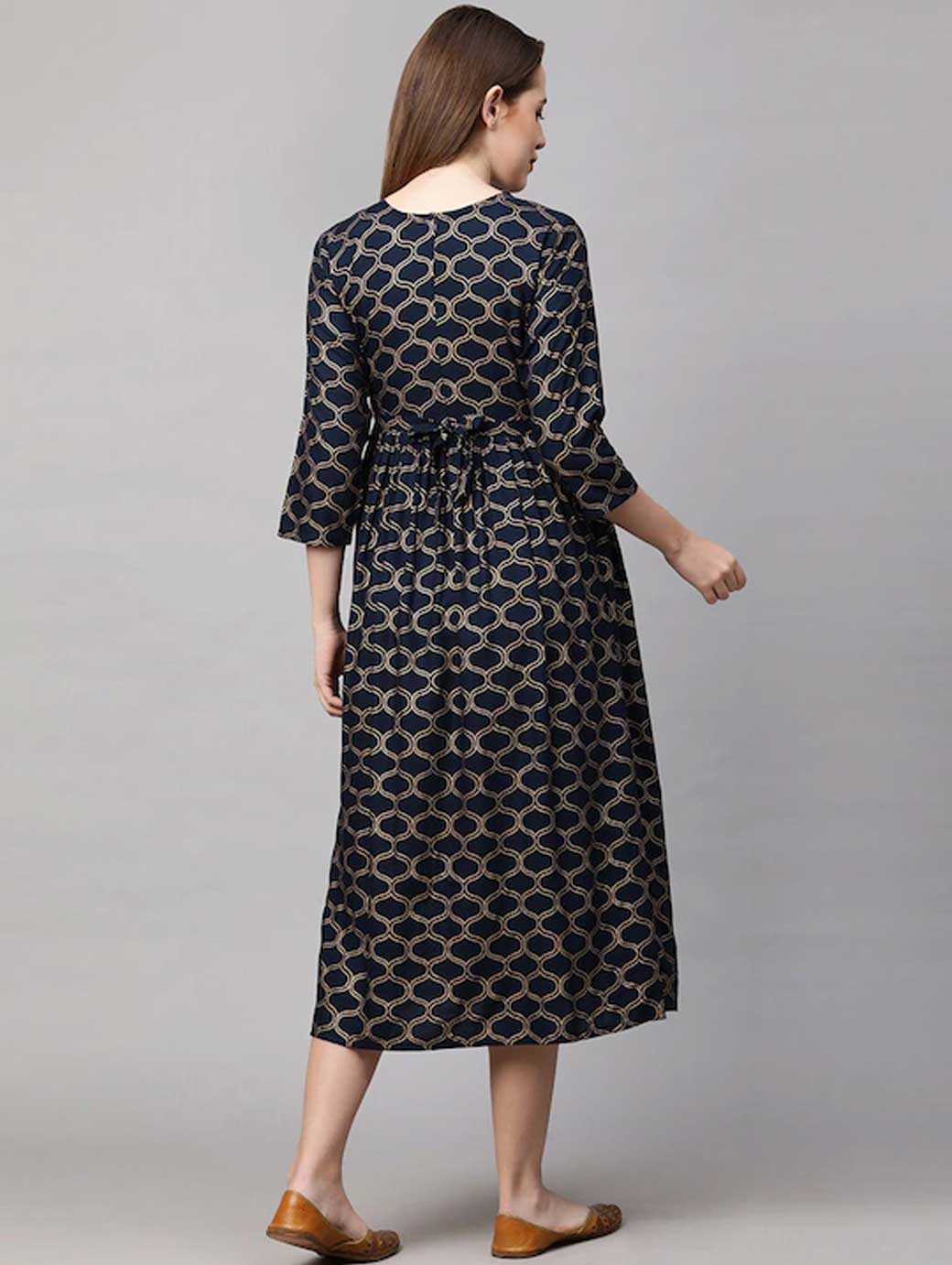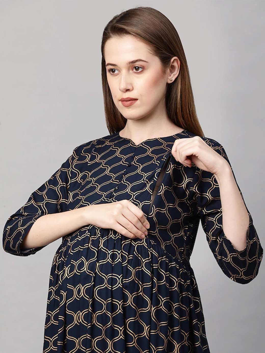 Navy Blue and White colourblocked knitted Nursing fit and flare dress, has a round neck, short sleeves, concealed zip closure, and flared hem