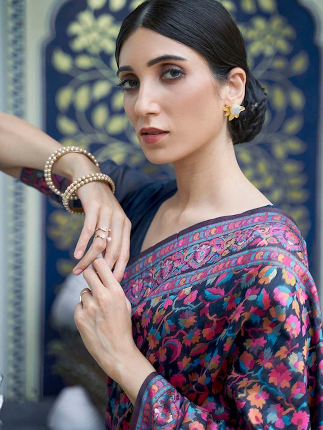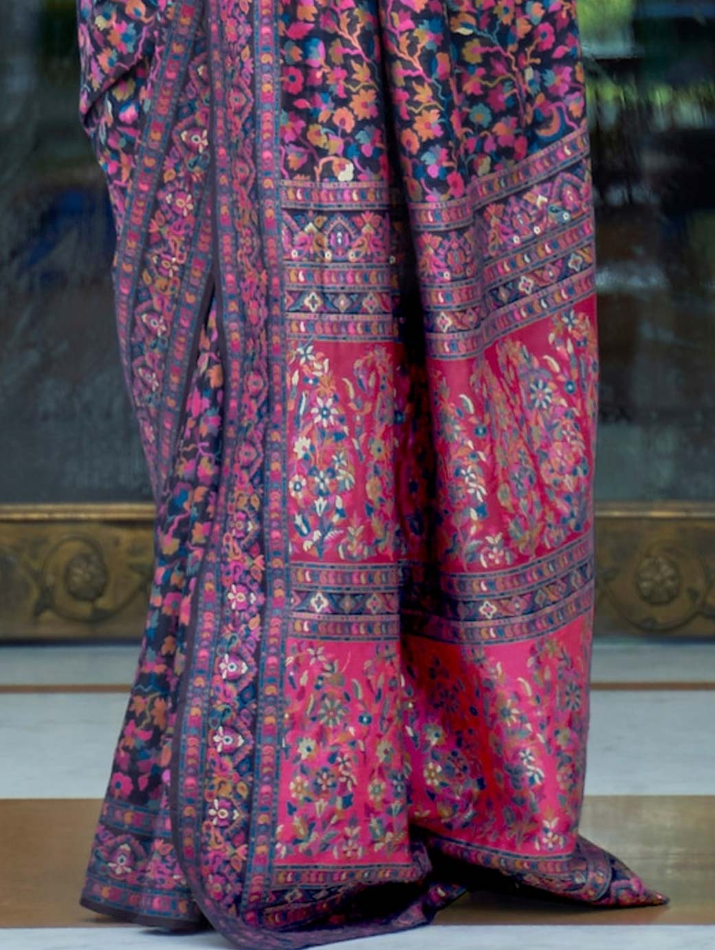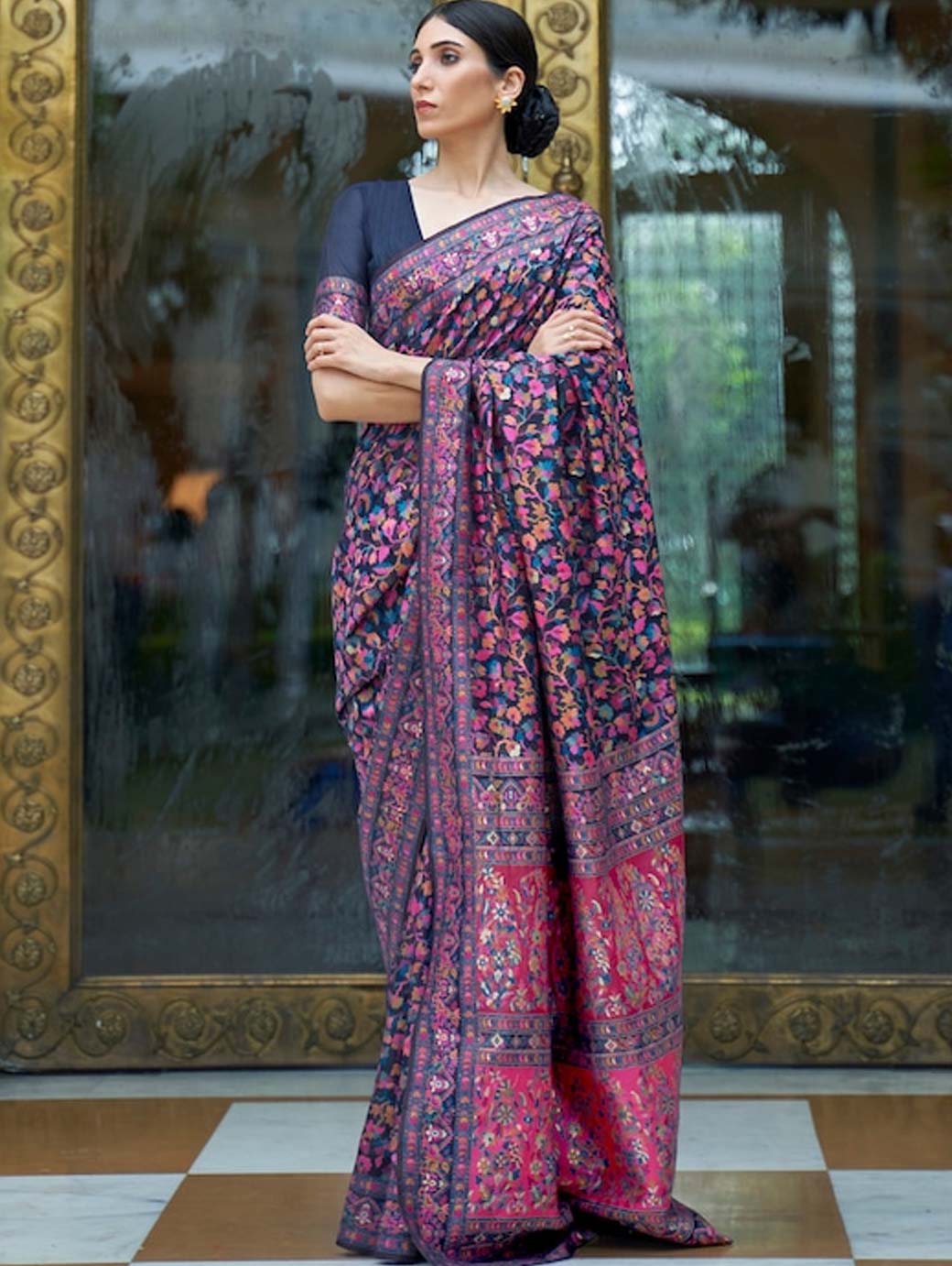 Navy Blue & Pink Floral Zari Silk Blend Banarasi Saree
