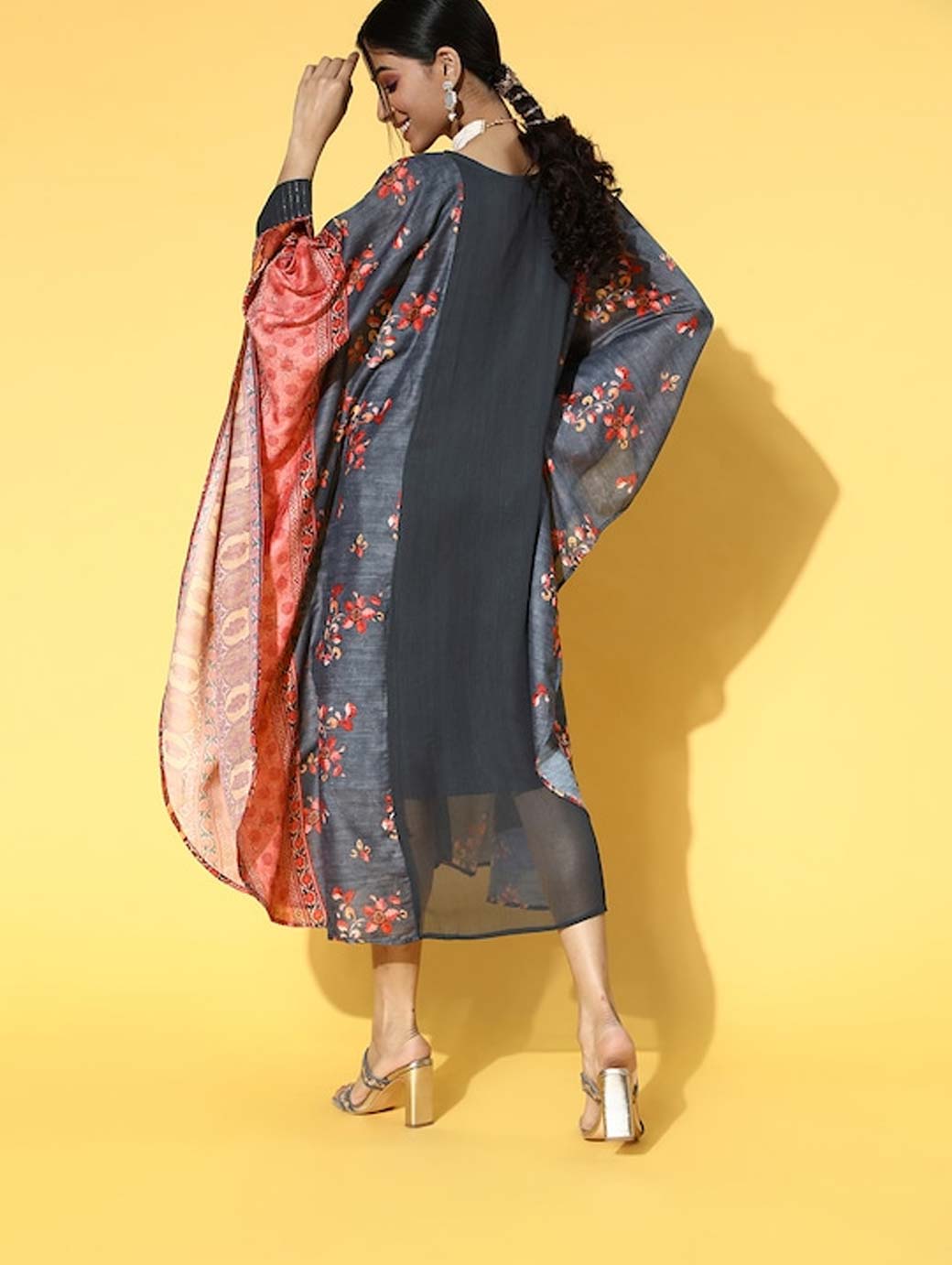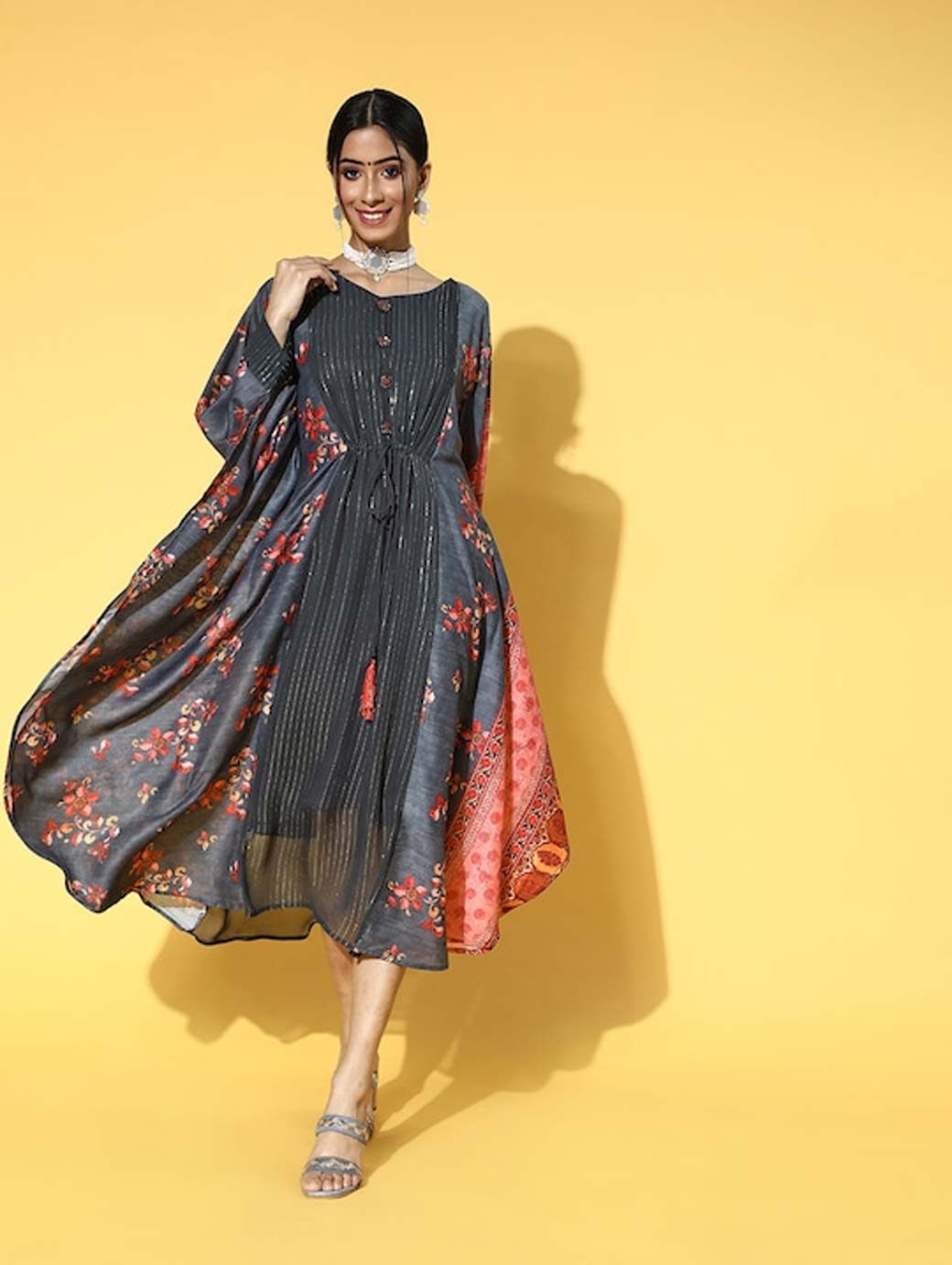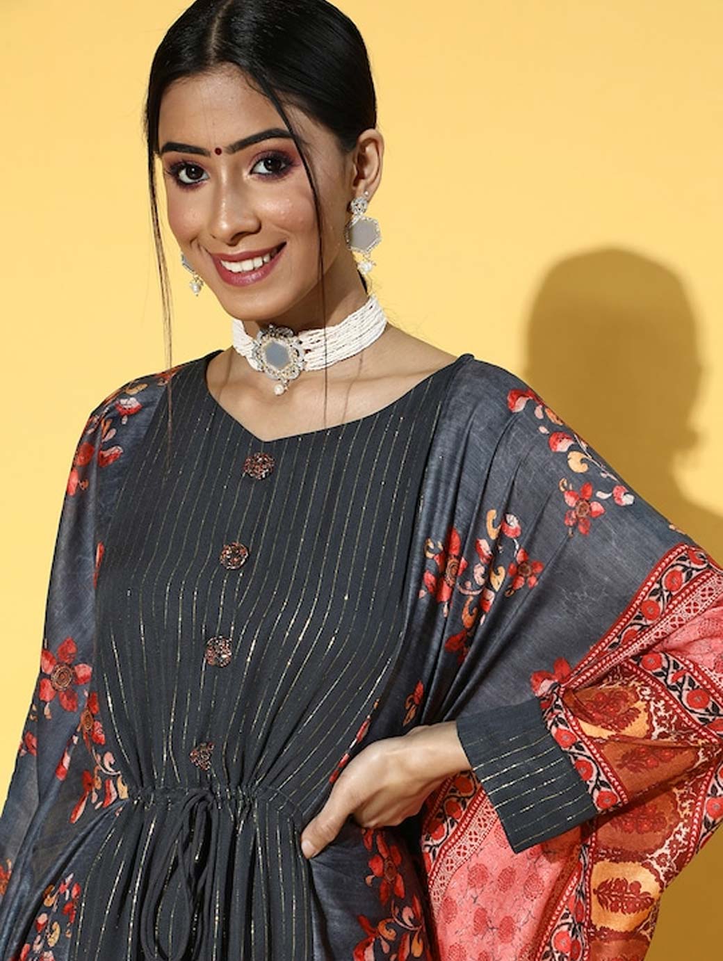 Women Charcoal Muslin Striped & Printed Kaftan Dress