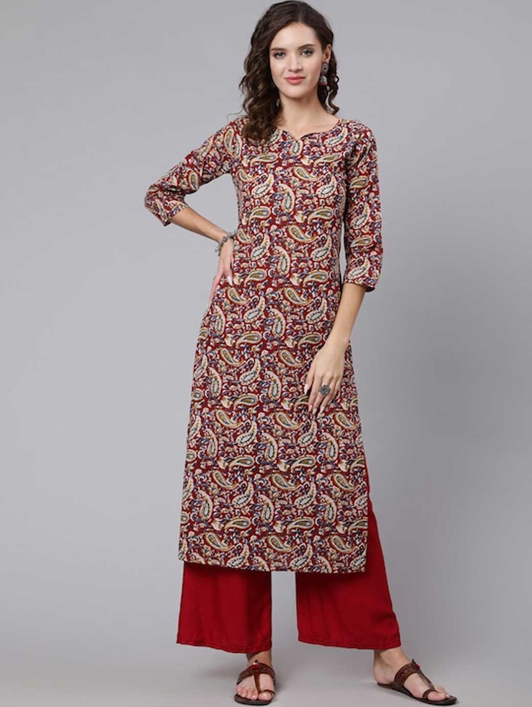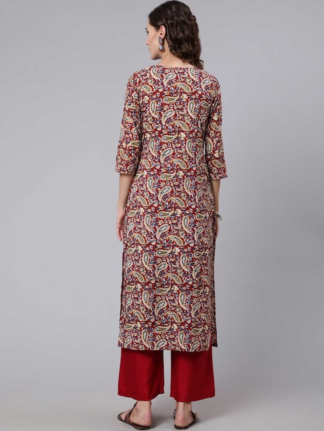 Colour: maroon, blue and beige Paisley printed Round neck Three-quarter, regular sleeves Straight shape Calf length with straight hem Machine weave regular cotton