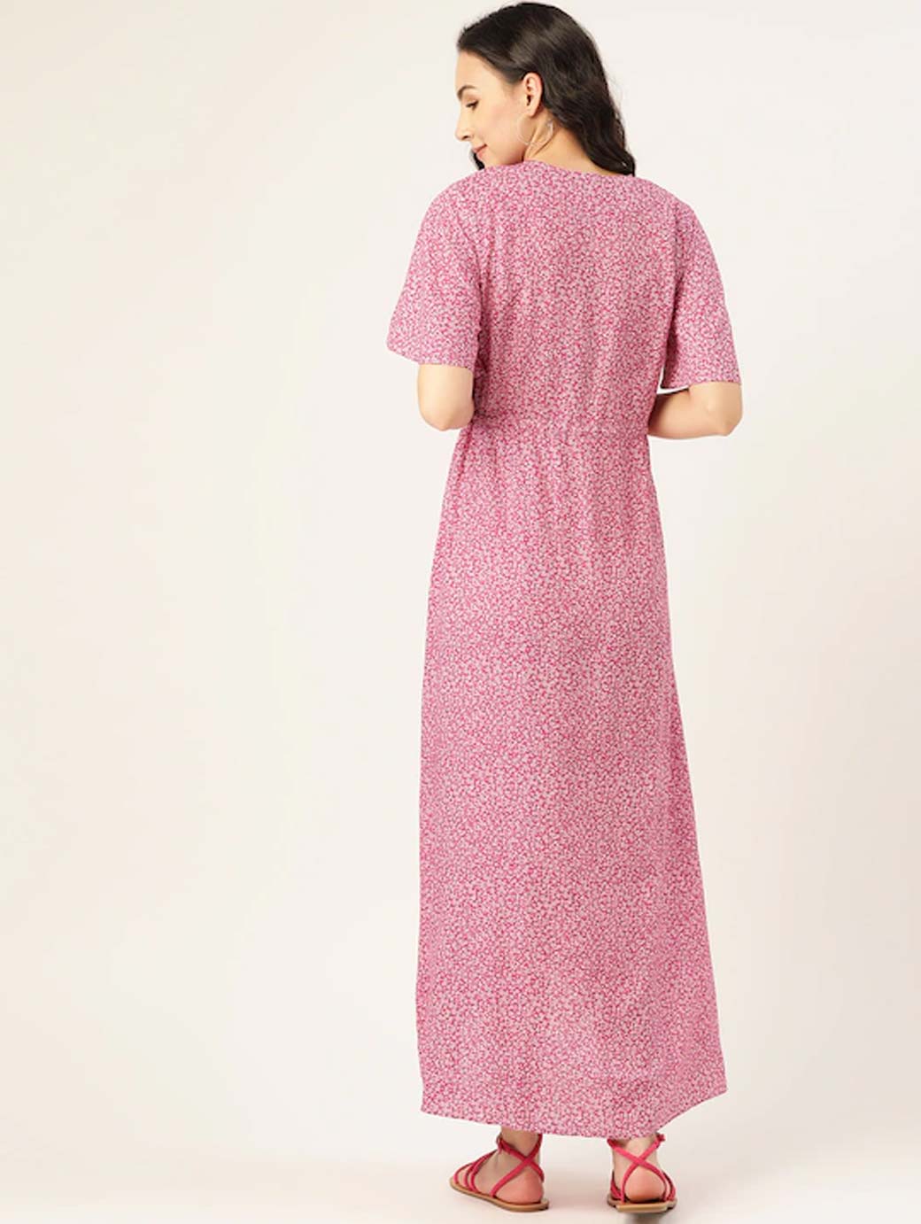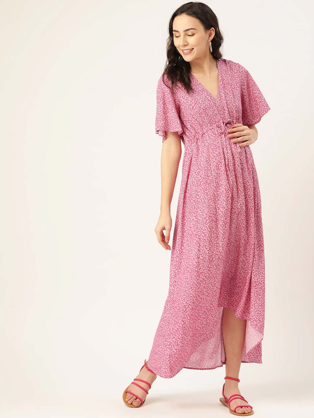 Pink and White printed woven Maternity maxi dress with tie-up, has a V-neck, short sleeves, and high-low hem Disclaimer: This product can be re-sold back to Vanca after proper usage for recycle at Vanca. T&C apply.